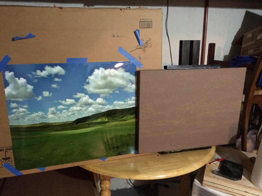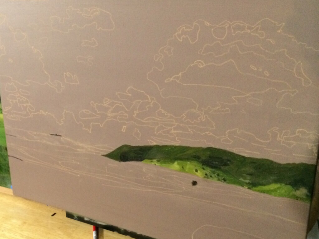 This painting to me shows the beauty of the surroundings and the well located clubhouse and cottages in the sand hills of Nebraska. This painting is my current one and I will be posting as it progresses. The first post for this painting shows my setup and staining of the canvas with my drawing done in pencil. The second photo shows actual paint on canvas, beginning with the cool landform located in the distance. 18×24 inches.