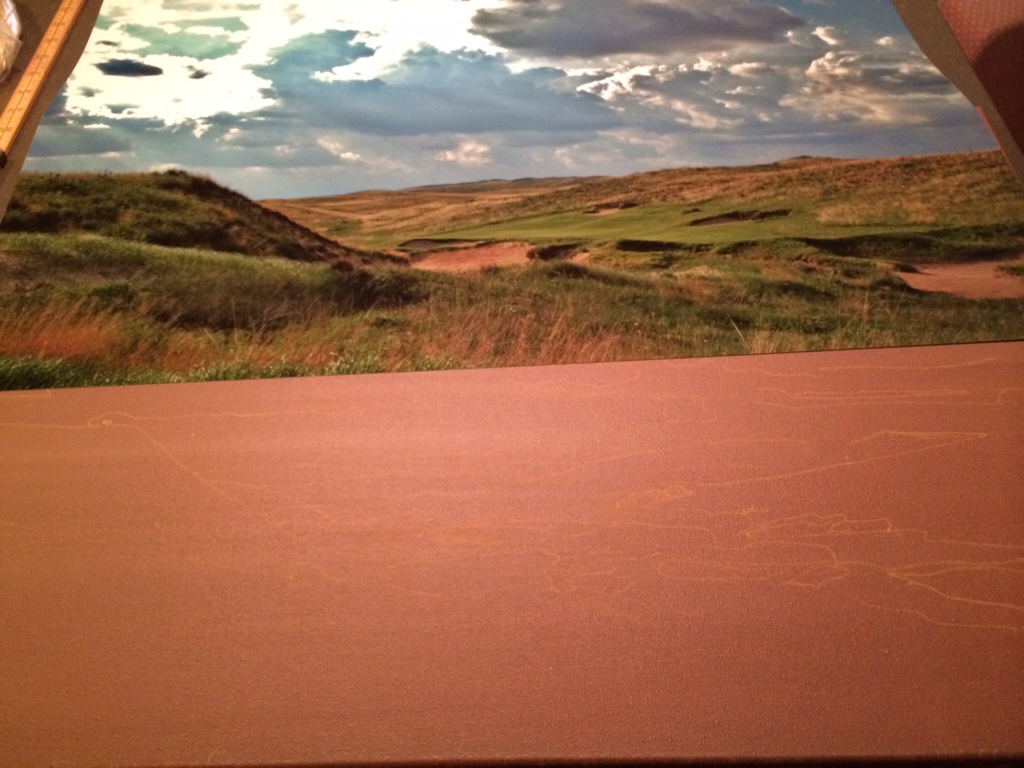 The prep work for my next painting is complete. Canvas is stretched and stained with burnt umber and quick drying white. Rough drawing is done with pastel pencil. This painting is the largest I have attempted yet at 20×30 inches. Lots of great clouds and ground movement, and frankly a great par 3 hole to play, should be fun.