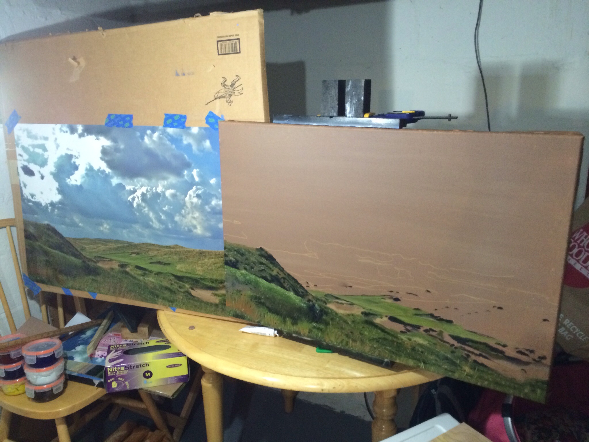 My focus was not the best this evening and I tried to stay away from detailed areas around the green and instead focused on grasses in the foreground of the painting. Only about an hours worth of painting tonight, hopefully tomorrow my focus will be better. The grass bunkers by the green have some great color and movement and need clear focus to get it right.