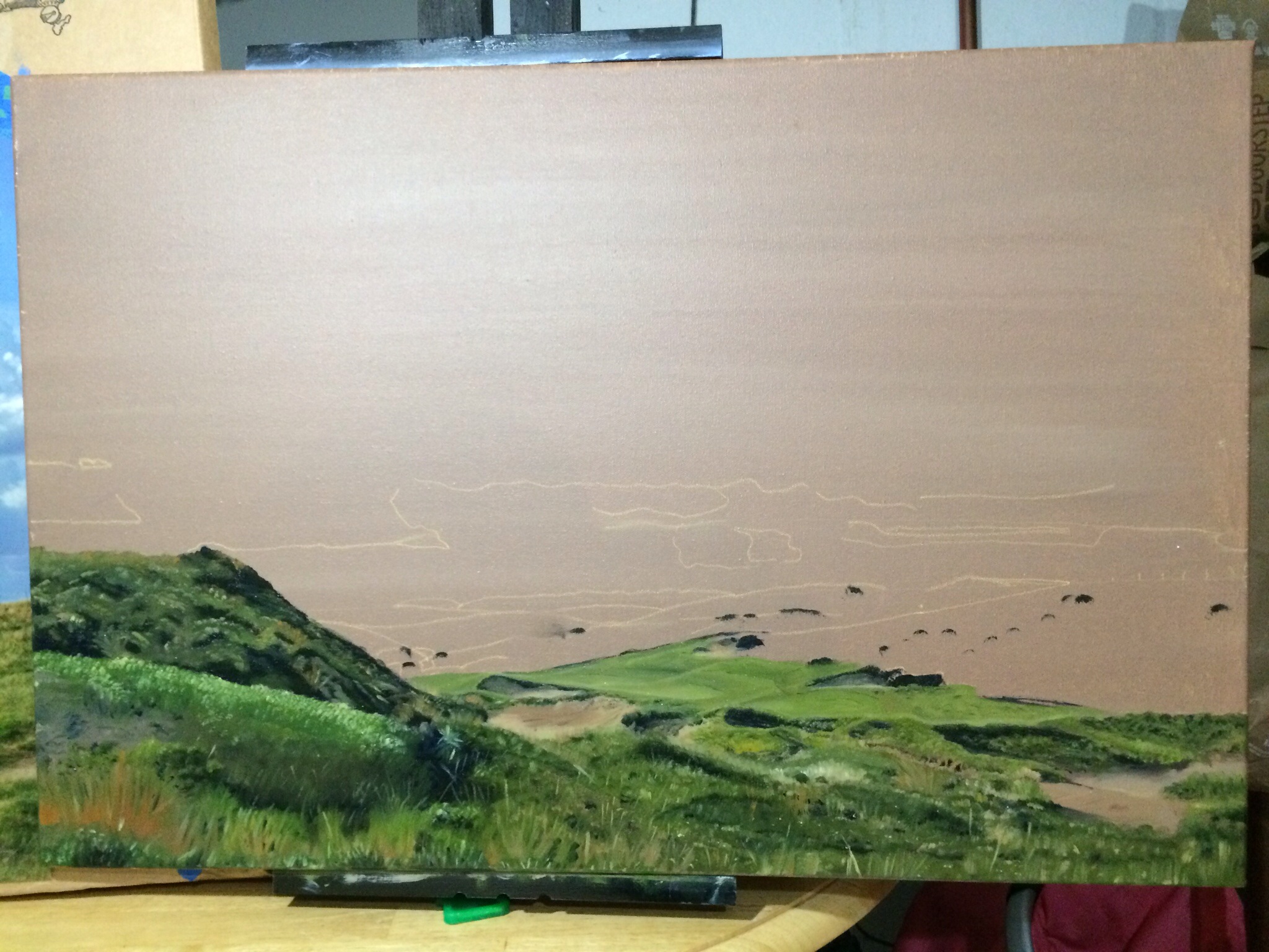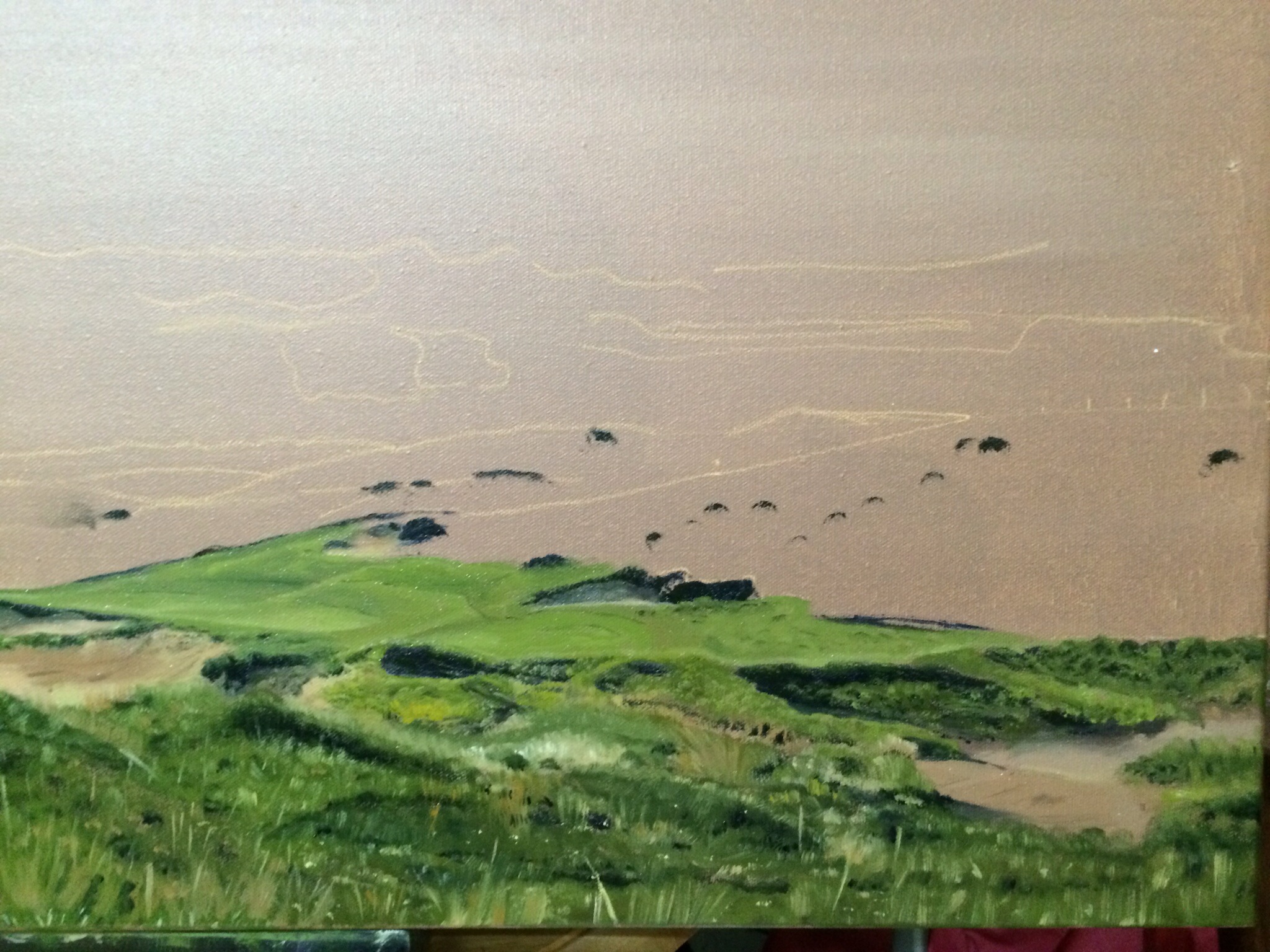 A lot more focused tonight and enjoyed the color variations in the grass bunkers. Still only using my Filberts #6 and #2. Lots of yellows and orange tones in the wispy grasses. Finished the foreground and heading on to the rolling sand hills next. Very pleased with how this one is progressing.