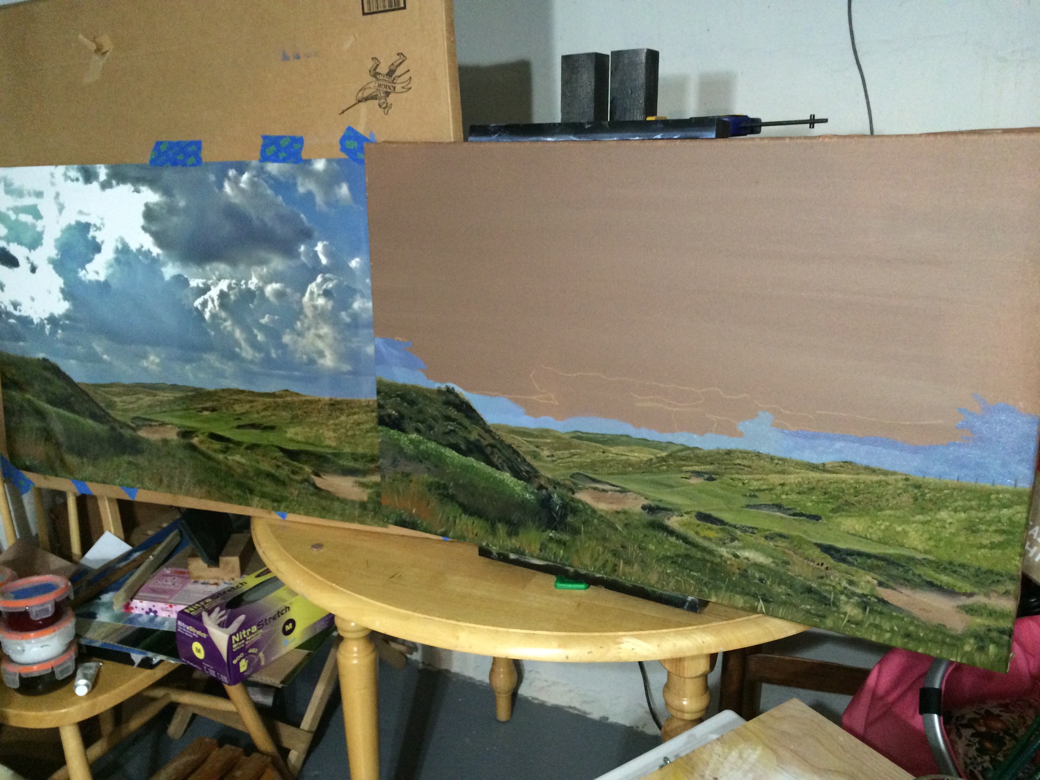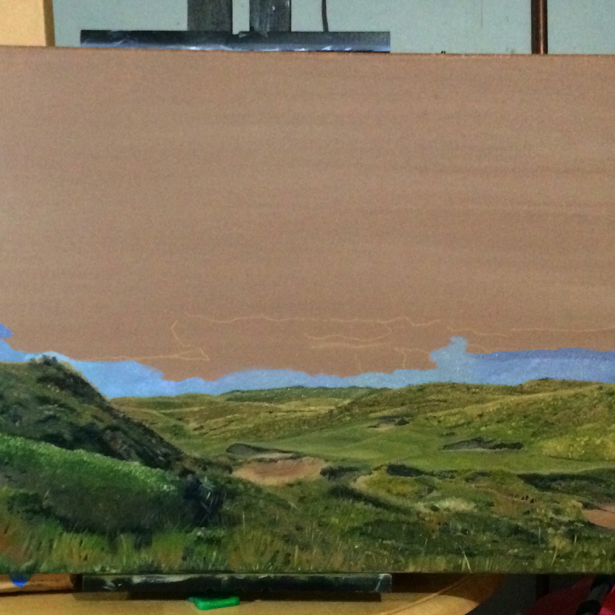 Dismal River White Hole 15 Part 8 September 29, 2014September 29, 2014 • jrbgolfs Starting the sky. Surprised how much red was required to create a purple hue to this sky. Also a little Burnt Umber mixed in with Ultramarine Blue to create the darker values. Share this: Share on Facebook (Opens in new window) Facebook Like Loading...