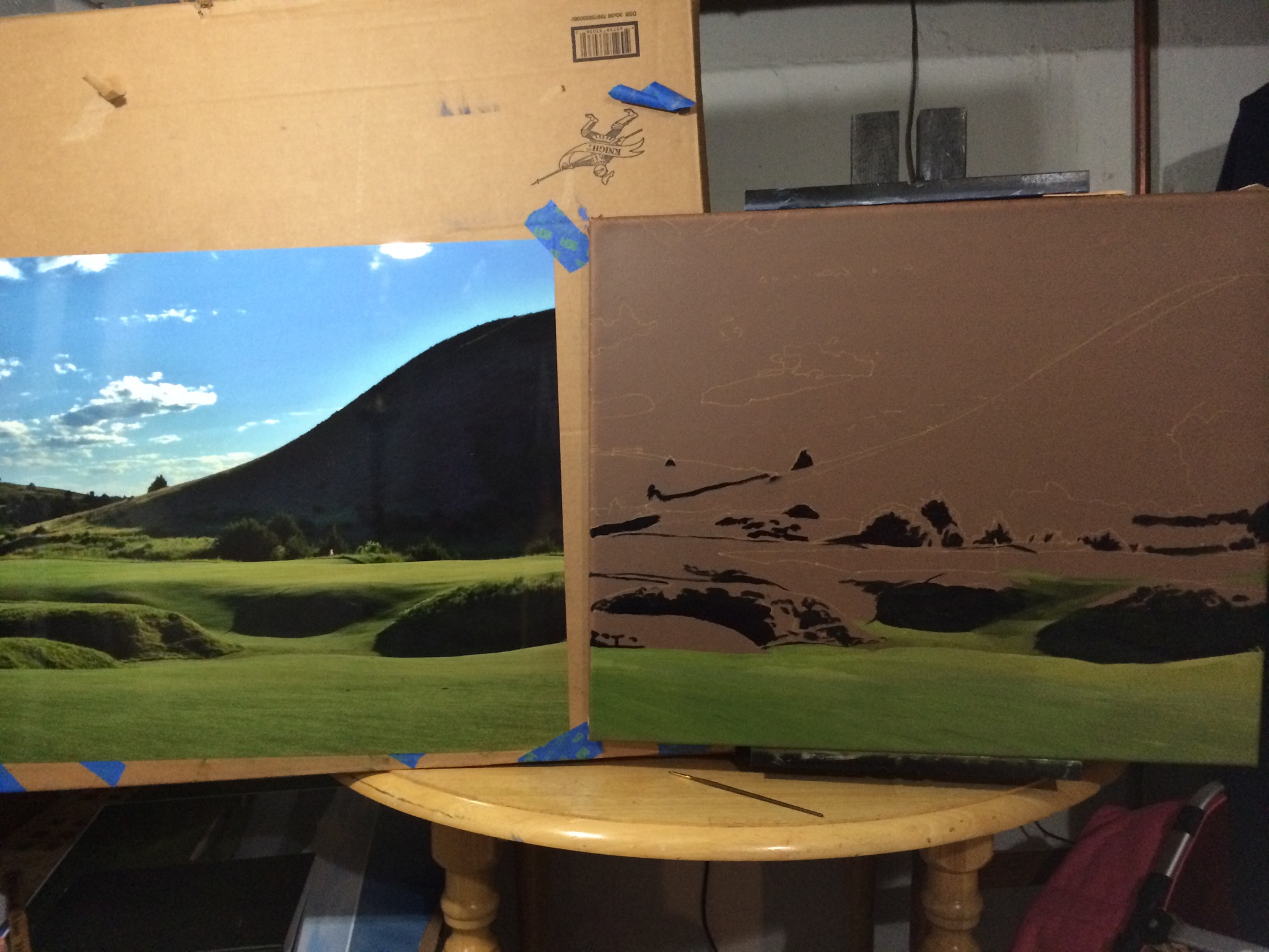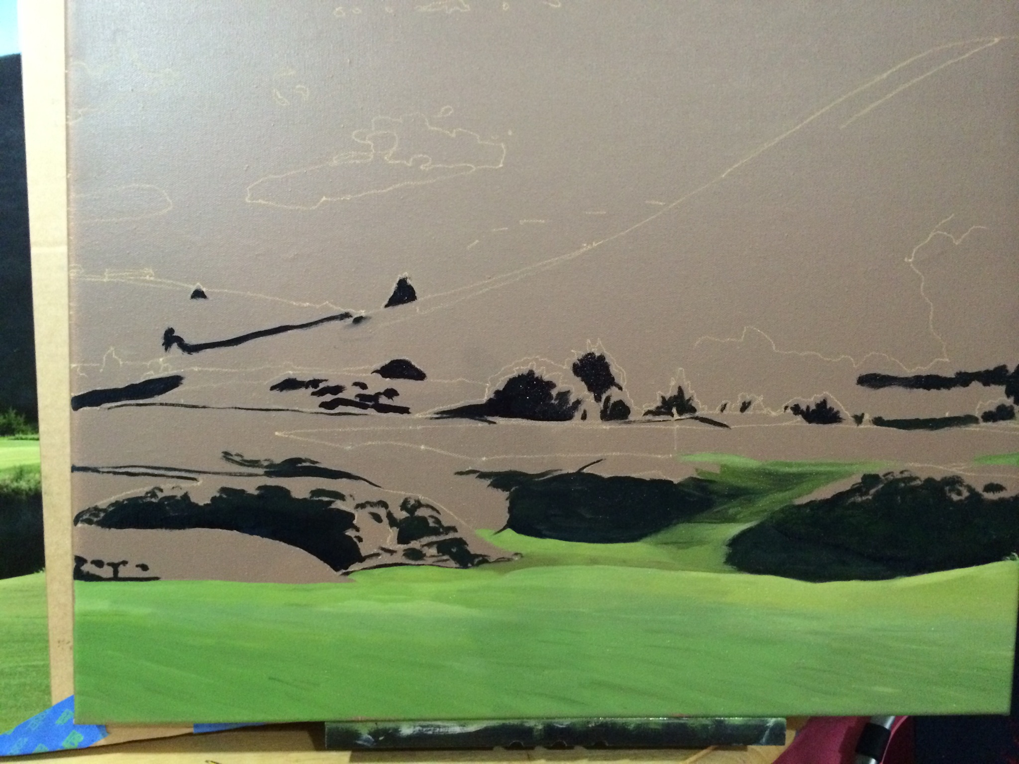 Dismal River Red Hole 18 Part 3 October 27, 2014October 27, 2014 • jrbgolfs Still focusing on the foreground including the fairway and wonderful mounding in front of the green. Much more cadmium yellow pale and titanium white. Still only four colors so far. May need some Alzarian Crimson on the hillside, but not for now. Share this: Click to share on Facebook (Opens in new window) Facebook Like Loading...