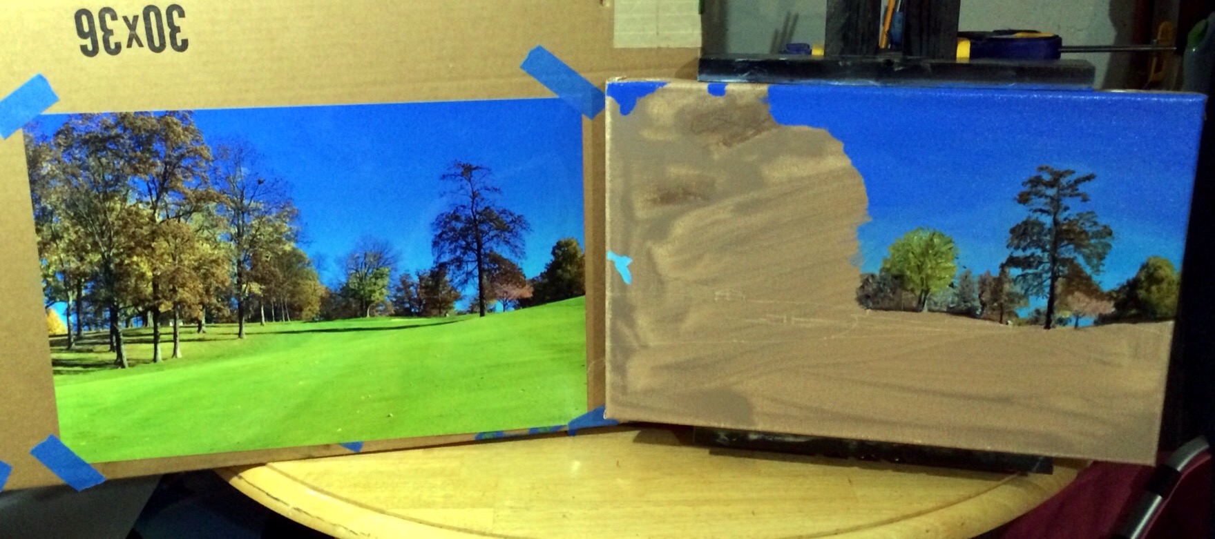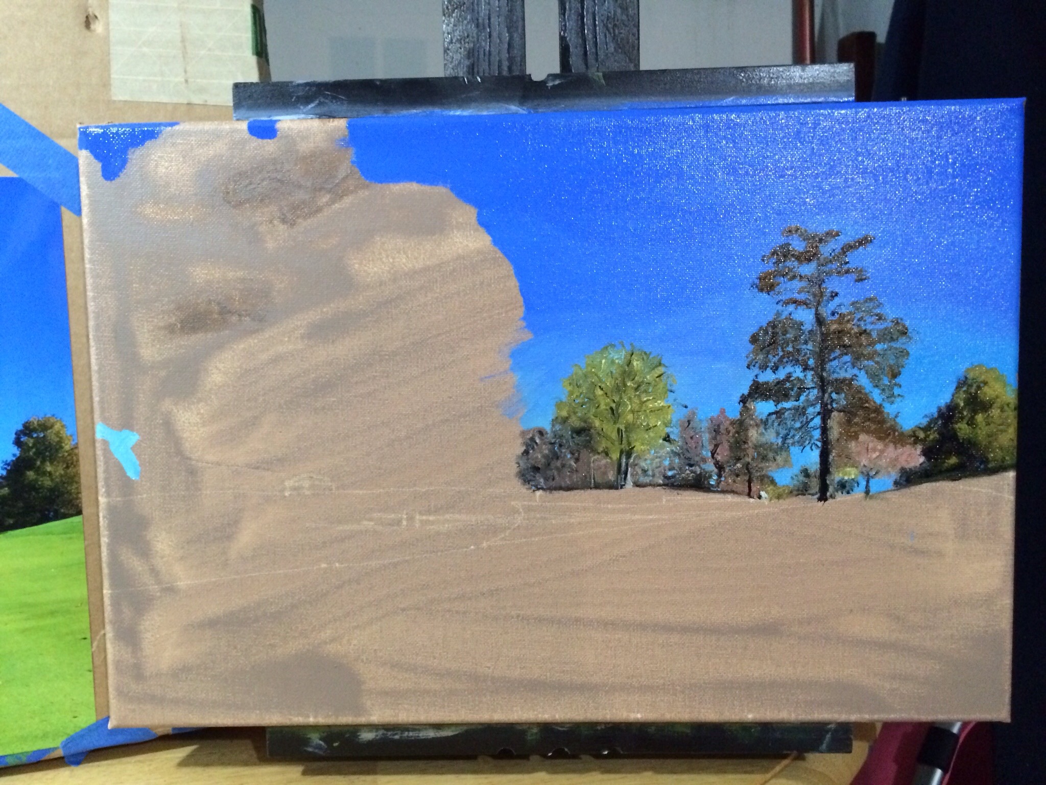Doing a smaller canvas as I plan to do a series of Urbana CC over the next few weeks. This one is 12×18 oil on canvas. Using paint from my last painting and proceeding right along. Trees are often tough to get detail and proper appearance. So far so good.
