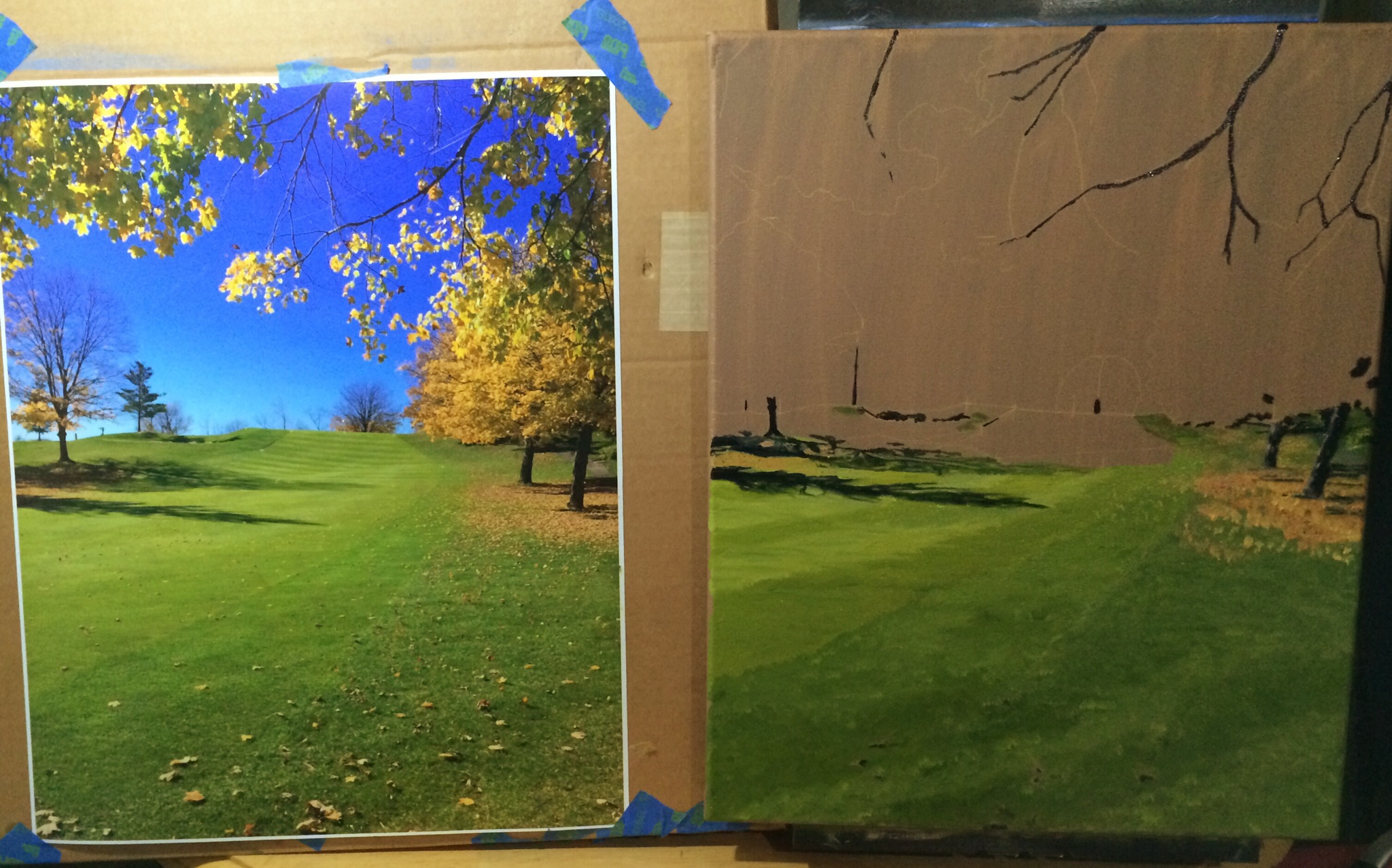 Great maple trees in full fall color on this one. Started with the basics, grass. Just Ultramarine Blue and Cadmium Yellow Pale for the most part. A touch of Burnt Umber or Titanium White, but not much of either. Leaves on ground have some Alzarian Crimson Red, once again not much. Moving right along.