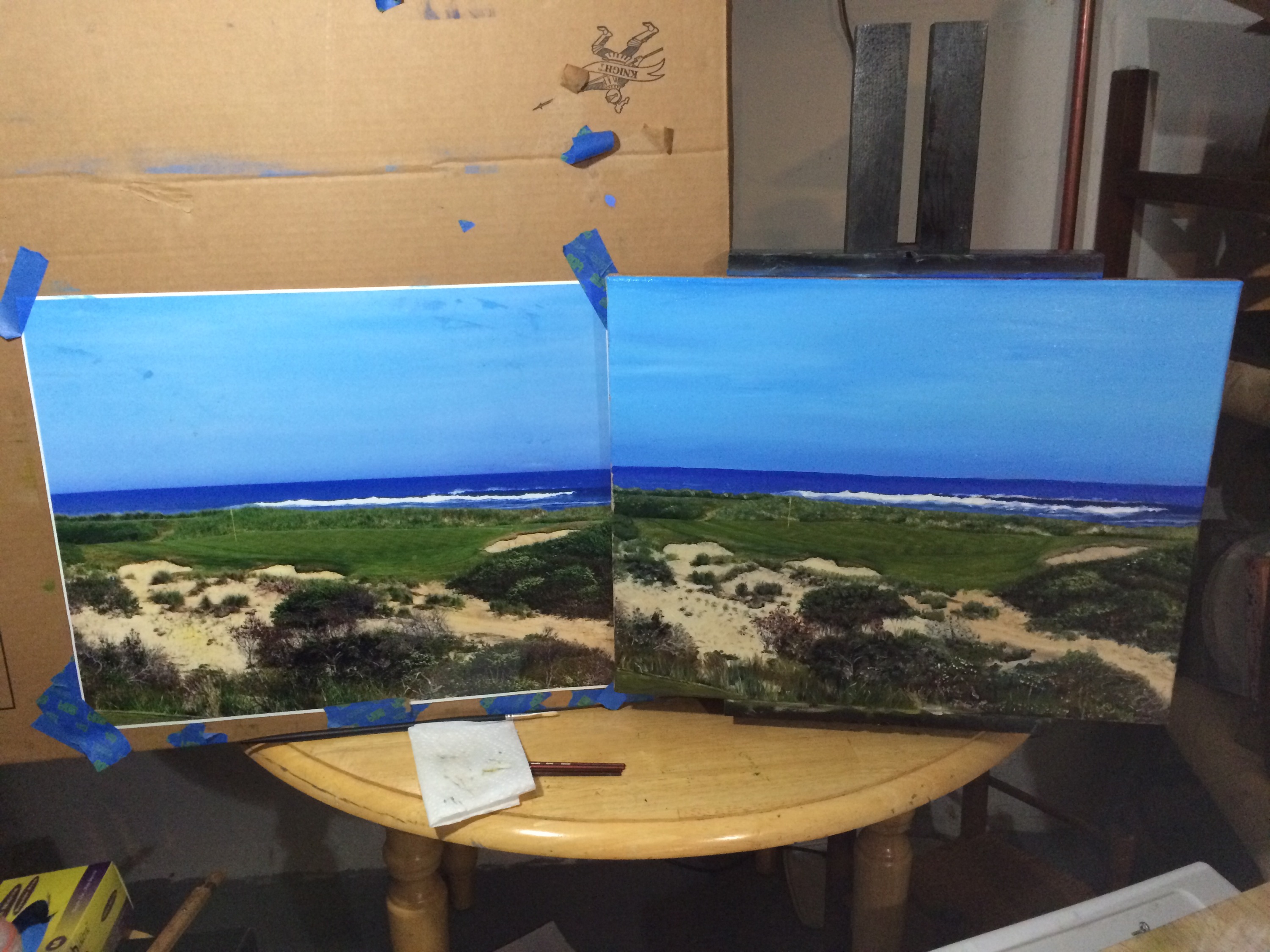 Maidstone Golf Club Hole 14 Finished January 14, 2015 • jrbgolfs This great par three had a lot of work to get the green, bunkers and scrub correct. More Alizarin Crimson in the scrub than I usually put in a golf course painting. Enjoy. Share this: Click to share on Facebook (Opens in new window) Facebook Like Loading...