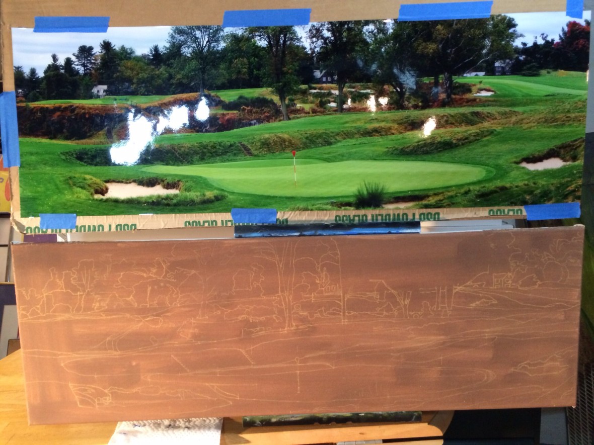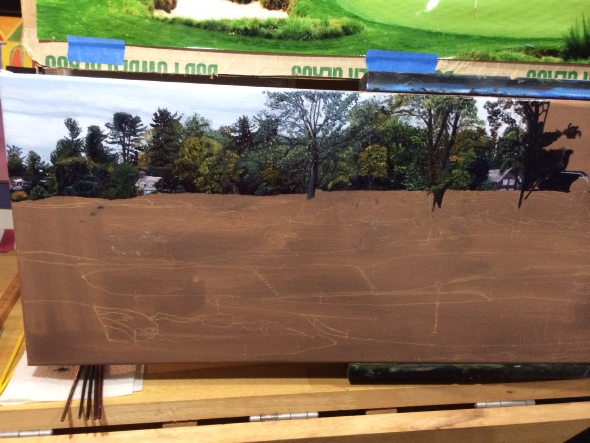 Merion Golf Club site of the U.S. Open in 2013 has some spectacular rolling terrain. This canvas is 12×36 inches and my work so far has been focused on the background, which is very detailed and has taken me about a week so far. Enjoy.