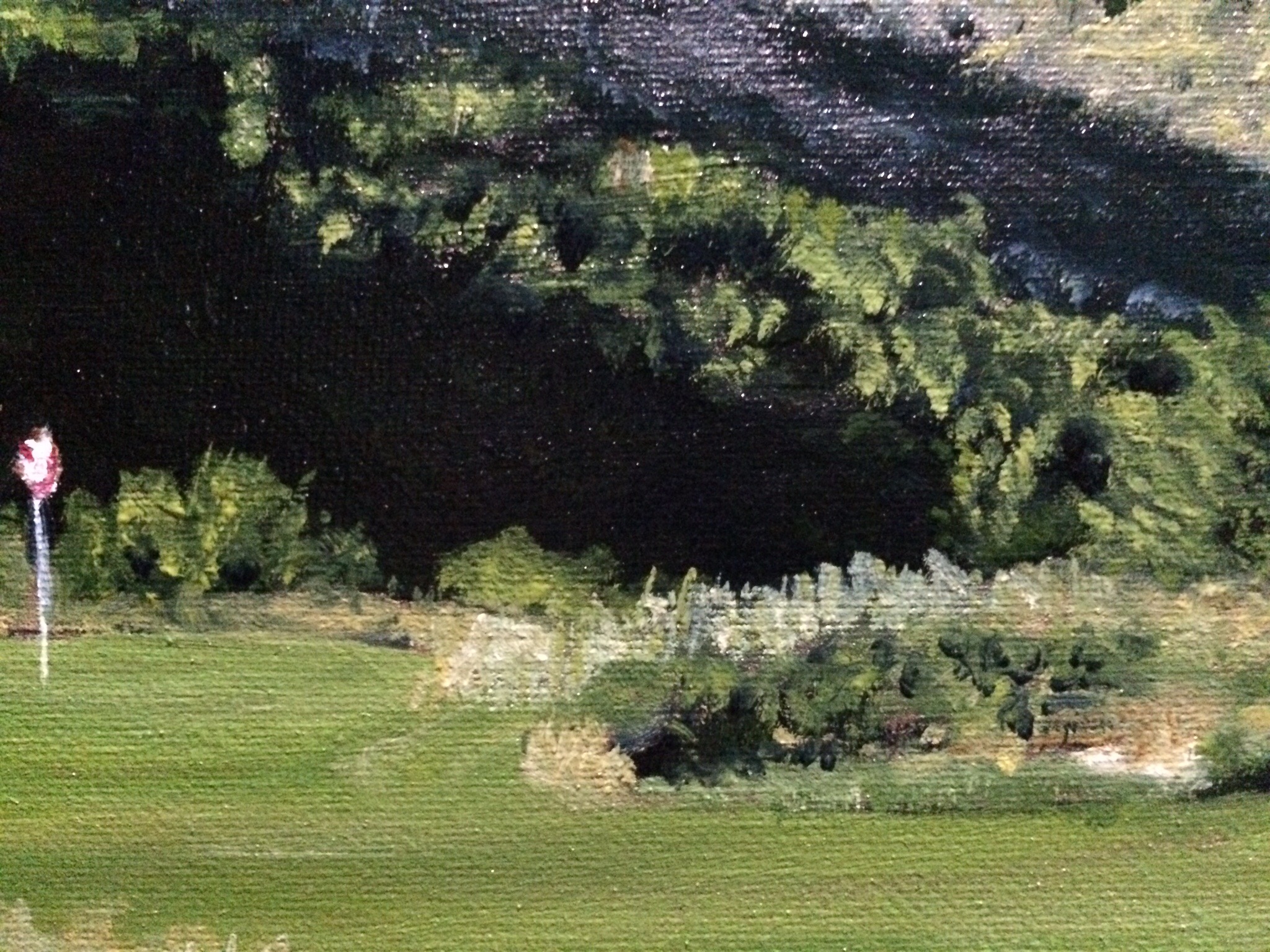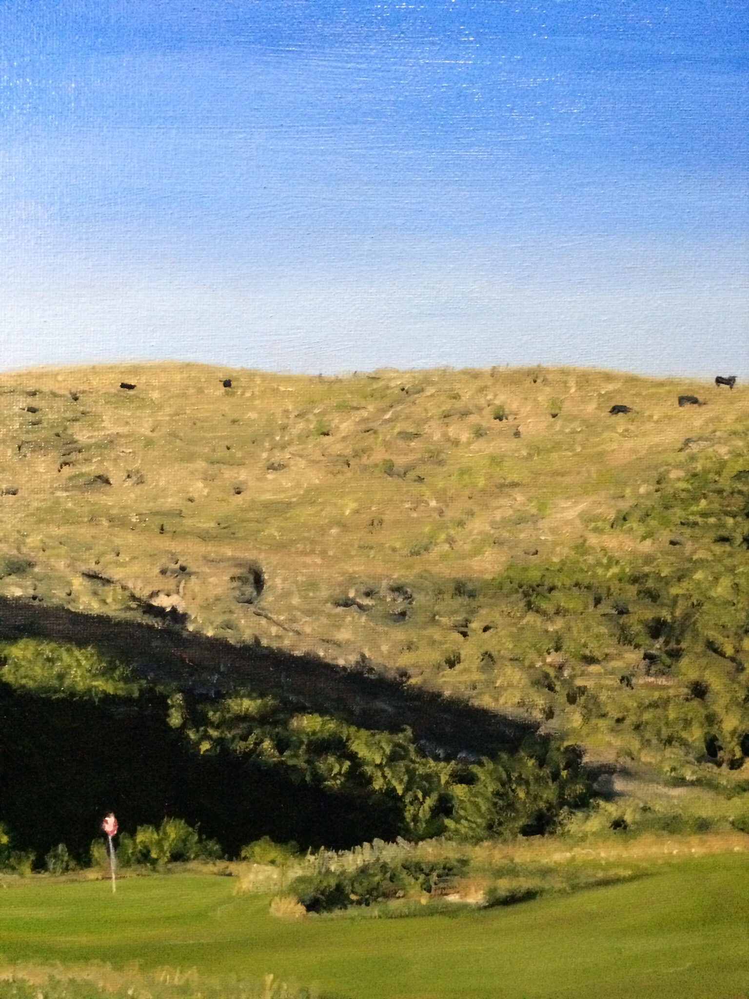 Dismal River Red Course, Hole 16 Finished August 2, 2015 • jrbgolfs This one came together nicely. This view of the 16th green is from the 17th tee and captures the cattle on the hillside in the background. Great spot and great hole. Some close ups so you can see the brush work. Share this: Click to share on Facebook (Opens in new window) Facebook Like Loading...