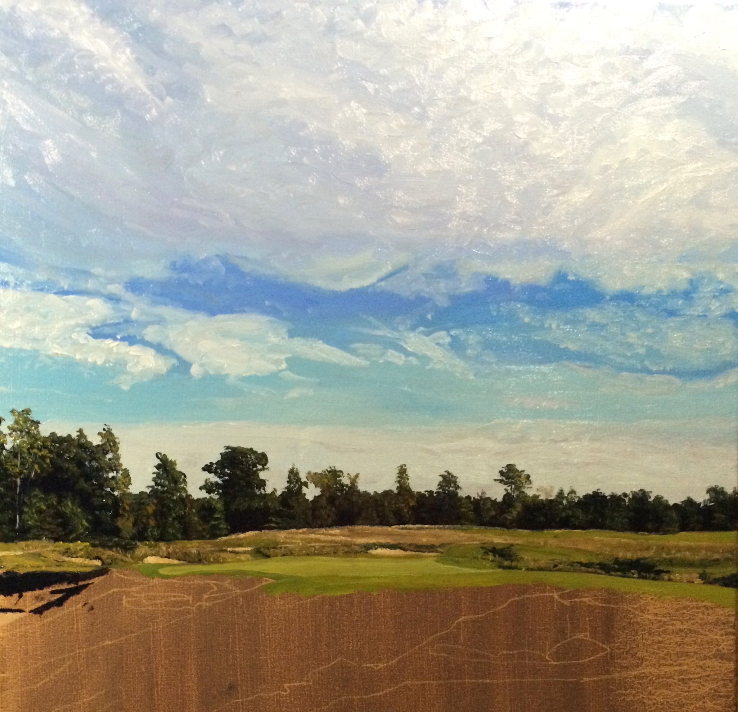 Tedious work last night, thought mostly done with Winsor & Newton Artists’ Oil Brush Filbert #2 versus small brushes. I find trying to use small brushes, other than for maybe the flagstick, takes away from the painterly feel of the work. Happy with how the green complex is going in and will have to wait just a little to put in the flagstick. Several bunkers are in and the grasses all around the green vary from lots of cadmium yellow pale, to more alizarian crimson, with touches of burnt umber. A great hole with great textures.