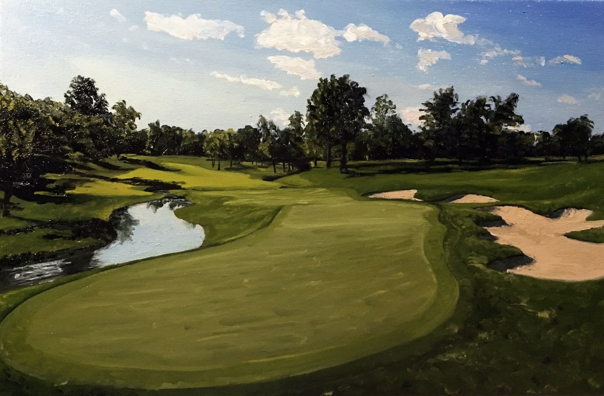 of one of the best short par 4s anywhere. The photo was captured to show the tough greenside hazards and rolling terrain faced off the tee. A brilliantly designed hole that provokes the long hitters to have a go and will always be remembered for Tiger’s unbelievable chip in from above the hole, simply impossible.
