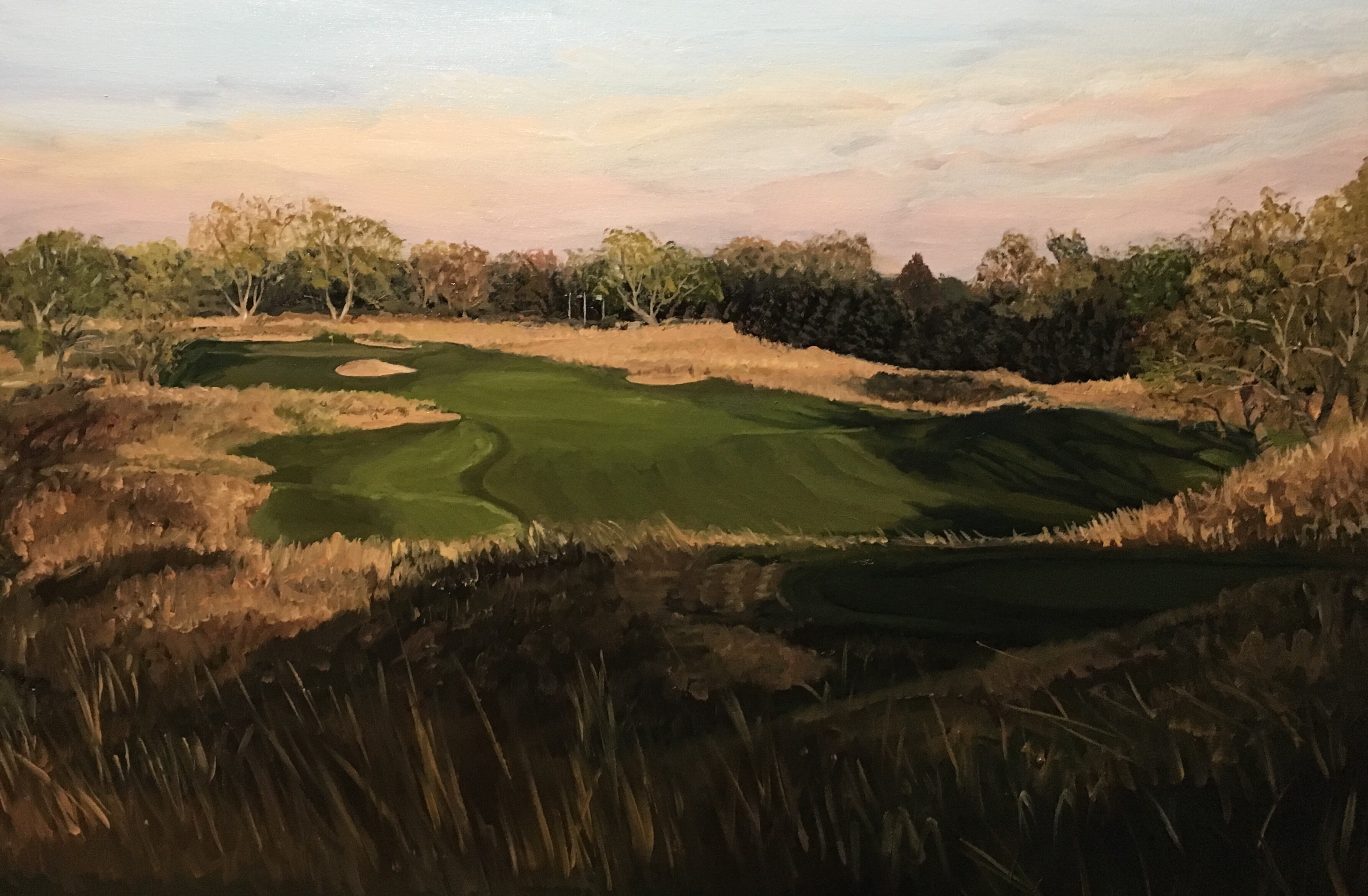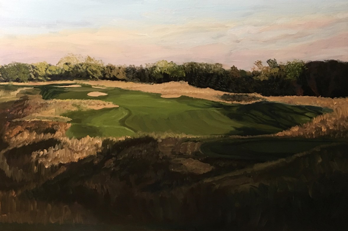 Prairie Dunes CC Finished March 31, 2017 • jrbgolfs Love the golden tones in this painting of the 6th hole. 20×30 inches 38.090712 -97.848337 Share this: Click to share on Facebook (Opens in new window) Facebook Like Loading...